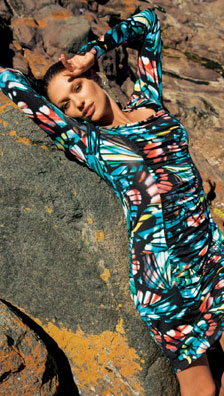 The pink ruched dress was a close runner up, but I can't help it – I am so in love with that crazy ruched print dress. I mean, sure, I wouldn't make it in that print, and the crazy picture on the rock is just… Well, it is in keeping with the oddness of Burda's styling decisions, but it was one of those irrational love at first sight things.