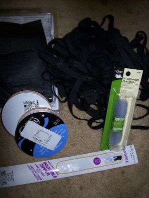 | Shoulder pads, 20 yards of elastic, clear elastic, grosgrain ribbon, invisible zip. |
