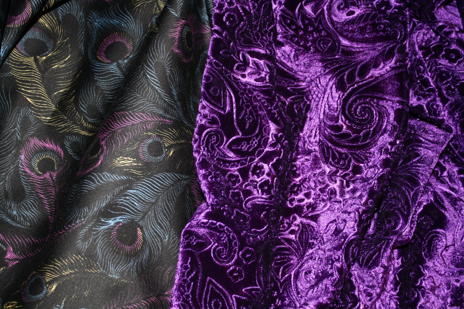 | Printed stretch cotton and purple stretch velvet. |