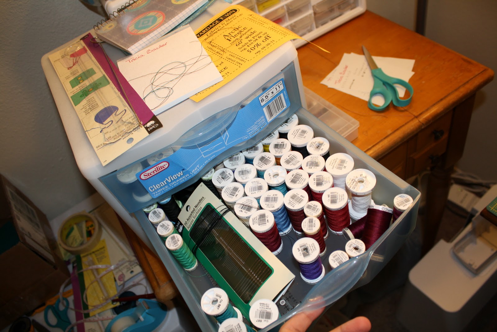 I have seen many other sewers with shelves or fabric closets. I would love to have the fabric out on a shelf and not stuffed into the plastic bins. However, since my apartment is a single room I worry a bit about the fabric getting smelly since there is no protection from kitchen odors, and I won’t be giving up garlic or onions any time soon. Also, I worry about sun damage and fading, another reason I moved the fabric to the back of the apartment. Since this living arrangement is temporary at best, I won’t be planning on upgrading this until I have a more permanent living situation in a few years.