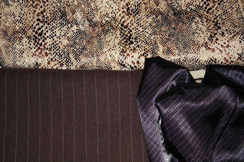 | More fabric – snakeskin mico suede, brown poly/rayon/lycra, and purple striped poly. |