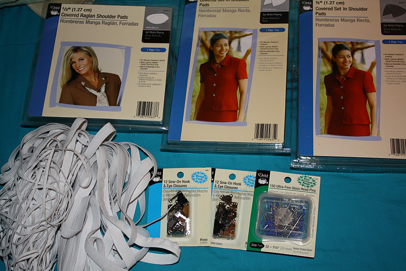 | Shoulder pads, a mess-o-elastic, hooks, glass head pins |