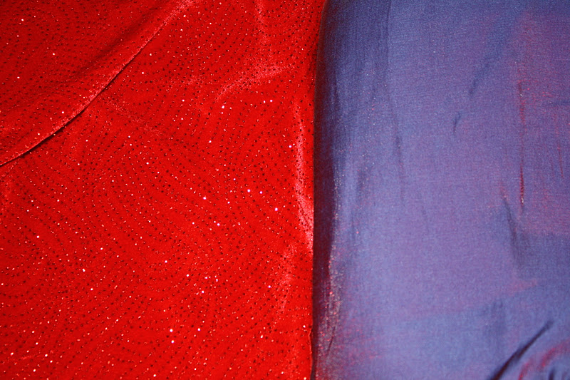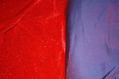 | Red glitter stretch velvet and purple/red shiny polyester. |