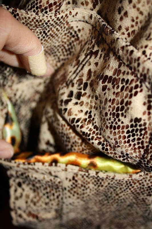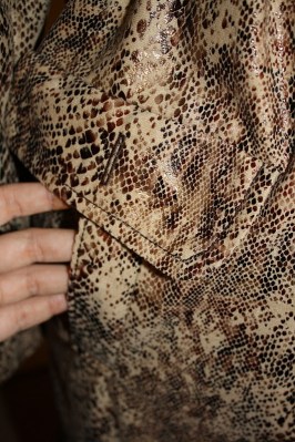 The sewing hasn’t taken nearly as long as the cutting and prep work (attaching interfacing and underlining). I decided to sew the lining first, and then to sew all of the detailed attachment pieces. That way when I was constructing the coat I could just focus on putting the big pieces together and not have to deal with changing thread (I am using a darker thread for my topstitch color, and a lighter thread for construction), changing presser feet, or worry about inconsistent buttonholes (well, for the small buttons – I haven’t done the large front buttons yet). I am not totally happy with the shape of my pocket flaps, and some of my topstitching isn’t perfect (I use the 3-step straight stitch so I can make the regular sized thread have a bit more impact, but sometimes my machine is not happy going over the bumps), but the crazy snake print hides a lot of the errors that would be much more visible on a plain fabric.