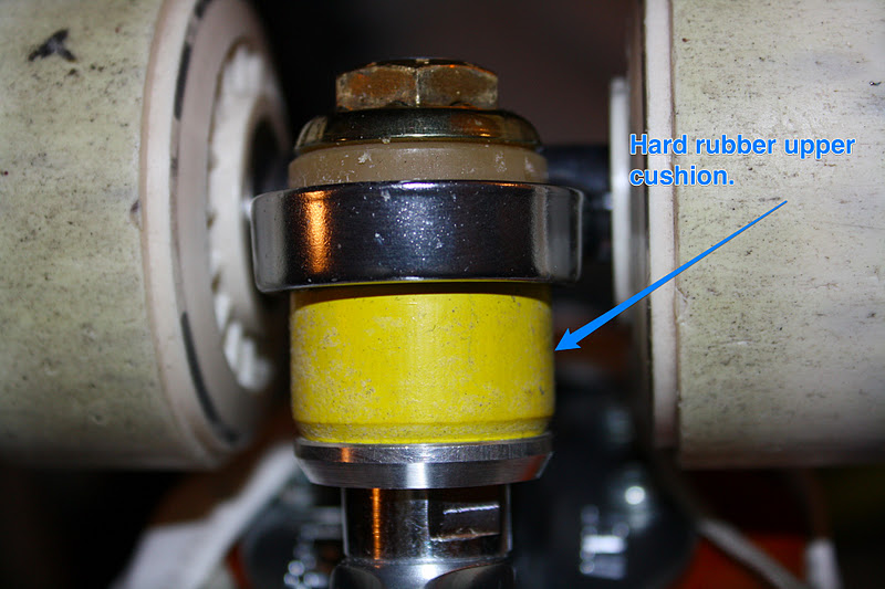 Well, when I started on this merry journey, I hadn’t planned on making it a 10-part post, but I guess that’s how long it took. I FINALLY have a happy combination in my loop skates that has lasted me more than a few days of practice, and on multiple floor conditions. After about two days of practice I couldn’t deal with the urethane anymore – it just doesn’t curve! I was on the softest urethane, almost completely loose action, and I was still having issues with the skate stopping short. Finally, what I decided to do was use the hard yellow upper rubber cushions and the extra soft green flexible urethane cushions on the bottom.