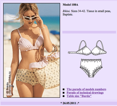 World’s most useless bikini. Looks like it is made of quilting cotton, it really can’t be useful for the beach, and it looks saggy, old, and ugly besides. Don’t even get me started on the matchy-matchy bag. Just awful.