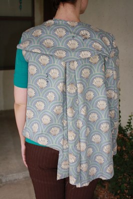 Usually I have a great fit right away with Burda, but with this muslin there were a lot of problems – the sleeves are too tight, the neck is to small, and despite the fact that the back is very billowy, it felt tight across the shoulder. Now, I could go up a size, but I think there would still be a lot of fit problems to deal with. I think that I don’t love this pattern enough to deal with the hassel of making all these changes. Plus I have reconsidered the wisdom of attempting a set-in sleeve with the rubber-backed material, and I think to give myself a higher probability of success I might look for a raglan sleeve pattern instead. I am still planning on making a hood though (detachable or otherwise). At the moment I am debating between the following two patterns: