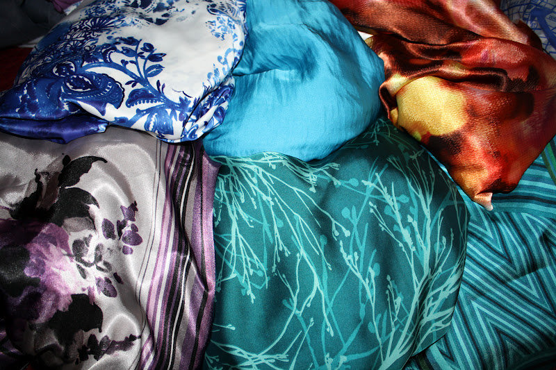 | The silky pretties – mostly for lining, and probably all polyester I LOVE the blue and white print in the back and the teal prints in the front. |