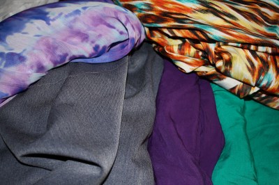 | Back: Tye-dye poly chiffon, multi-colored leopard poly print. Front: Grey fabric for pants, purple is a rayon challis or maybe a silk/cotton blend, and green is a rayon challis. |