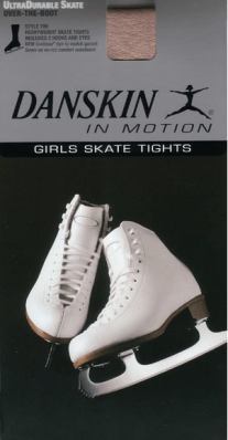 Pros: These tights came in footed and over-the-boot varieties. They were soft, stretchy, and had a decently sized waistband. They were the perfect thickness for competition – not so thick and to be fuzzy, but not so thin as to show the skin’s imperfections (aka bruises) under the tights. The over-the-boot sort had the perfectly sized opening for the boot – not so big as to constantly slide up the leg, but not so small as to not fit over the boot. The elastic around the bottom of the opening kept the tights in place, but there were optional hooks that could be sewn on if necessary. The optional hooks made placement for custom sizing very easy, but most people didn’t use them because they didn’t need them. These tights also came in several colors – Light Toast (for medium skin tones), Classic Light Toast (a slightly deeper tone with more red, great for darker skin or very tan people), and black (good for skaters on precision teams who need to match or need black tights for specific costumes).