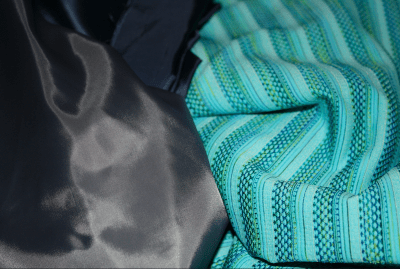 Back – lace print cotton jersey, teal/black stripe knit, green/yellow poly knit.