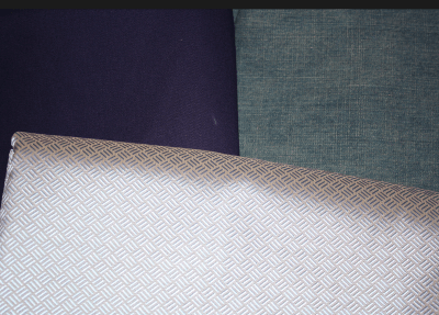 | Navy cotton twill, denim, and blue/gold brocade. |