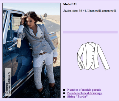 Ok, so last month on the sewing front I managed to make two jackets. Or, well, I made one jacket and finished most of a second one. The only thing I haven’t finished on that jacket – the bound button holes. To be more specific, the inside of the bound button holes. That jacket also has a very spring/summer feel to it, so I am not as motivated to finish it as I probably should be. But I do love the pattern I made it from – Burda 06-2012-121: