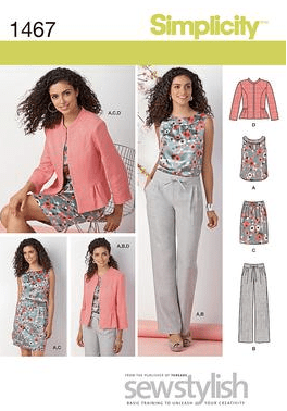 | S1467 – The tank top and jacket would be good pieces in a spring wardrobe. I think I like the peplum jacket from the February Burda a bit better though. |