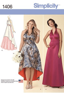 | S1406 – Another fancy dress. I actually really like the idea in the drawing of using the high-low hem over a full length skirt. |