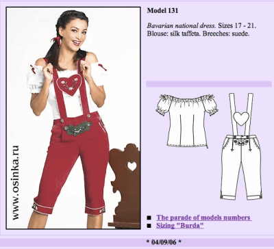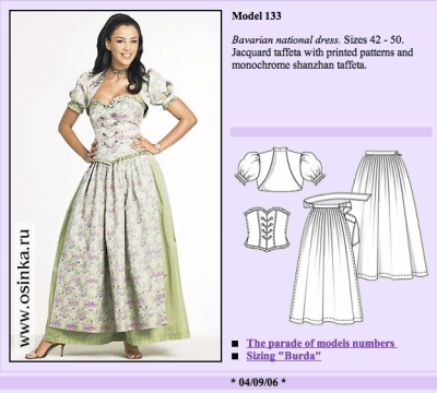 Thirdly – I got a new commission, but it is NOT for a skating dress. It is for… wait for it… a DIRNDL COSTUME! That is going to make a trip to be worn at Oktoberfest in Germany! You guys – I’m sending Burda back to the Motherland. To paraphrase Stephen Colbert – it’s like I’ve been training my whole life for a race I didn’t know was coming. Except the timeframe is really more like only the past 3-4 years, but whatever. The good news – Burda has TONS of dirndl patterns.