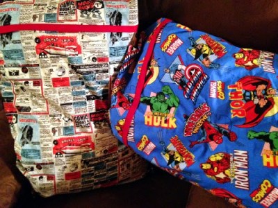 In case it wasn’t obvious, I made these for a big comic book fan – the Marvel print is from Hancock Fabrics, and the really fun old-school comic book advertisements was found at Michael Levine’s in Los Angeles. Used the same Crafty Gemini Youtube tutorial that I’ve used in the past, with continually awesome results.