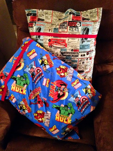 In case it wasn’t obvious, I made these for a big comic book fan – the Marvel print is from Hancock Fabrics, and the really fun old-school comic book advertisements was found at Michael Levine’s in Los Angeles. Used the same Crafty Gemini Youtube tutorial that I’ve used in the past, with continually awesome results.