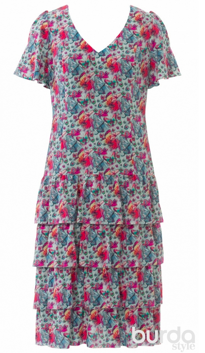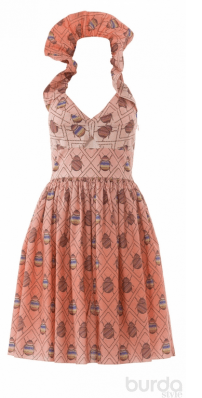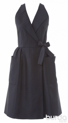I love this! Aside from the fact that it makes it rather awkward to wear normal undergarments, it looks like it would be a very interesting dress to sew and wear. I also love the inspiration for using an unusual print. Without a doubt the most interesting design in the magazine.