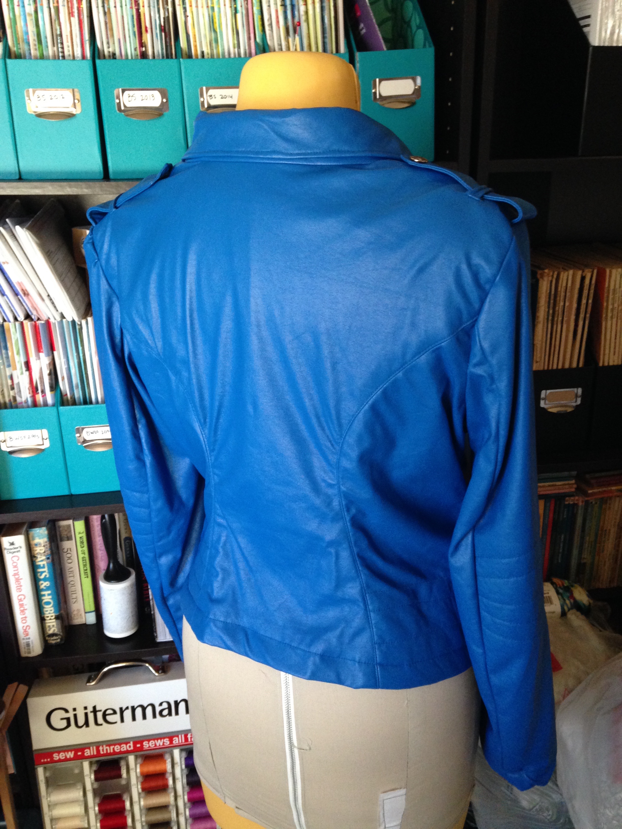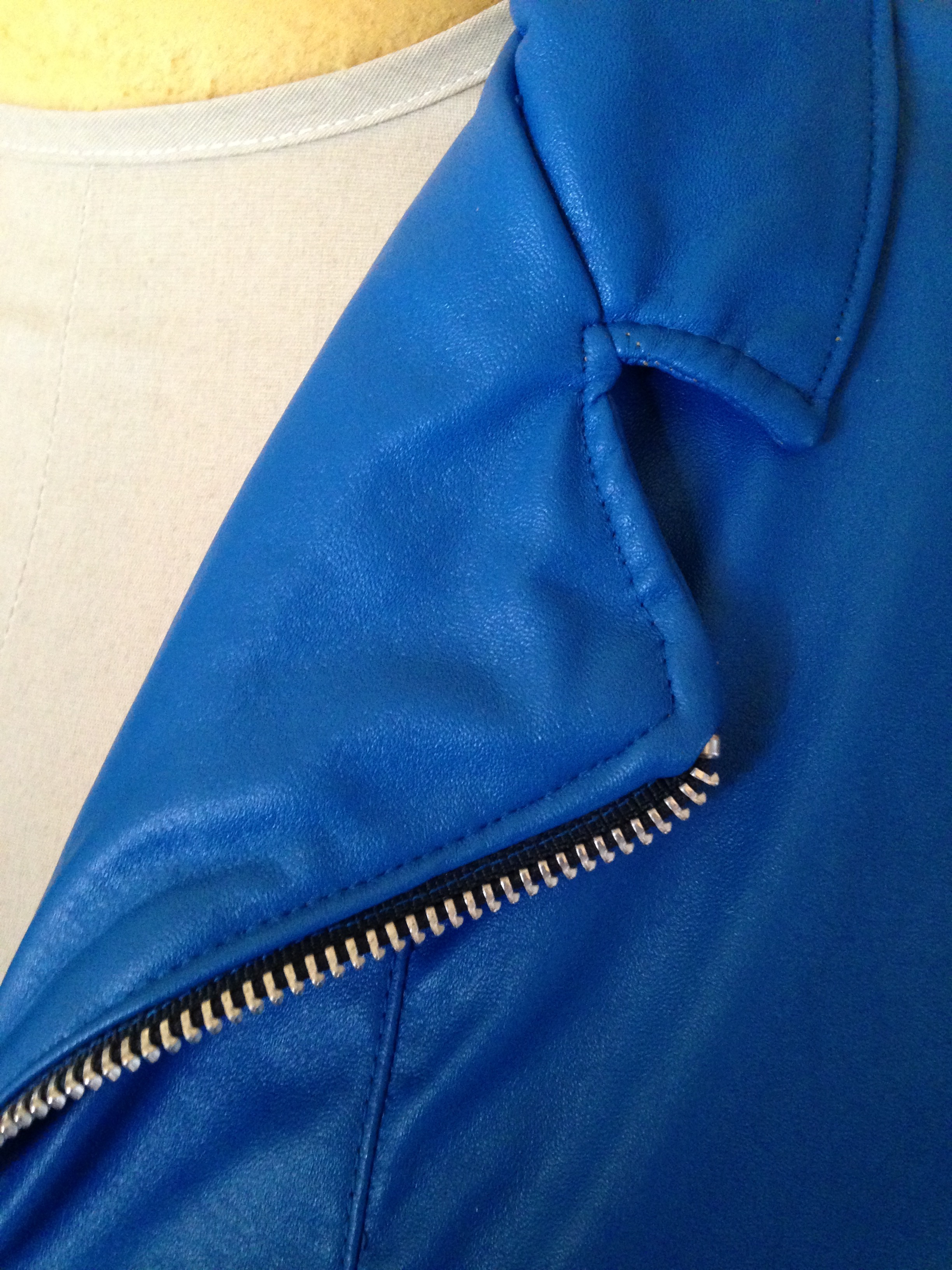 I will admit to having bought 3 different blue leather and/or vinyl fabrics before finally finding this bright blue fabric in LA’s garment district.  It was just sitting on a street corner and the seductive $10/yard price tag didn’t hurt much either.  Which means I’ve got a nice stash of blue faux leather right now.  I bought the zipper from Wawak, and I also bought the tools to shorten it.  It was the first time I’ve ever properly shortened a metal zip – it was actually much easier than the video I found on YouTube would have suggested.