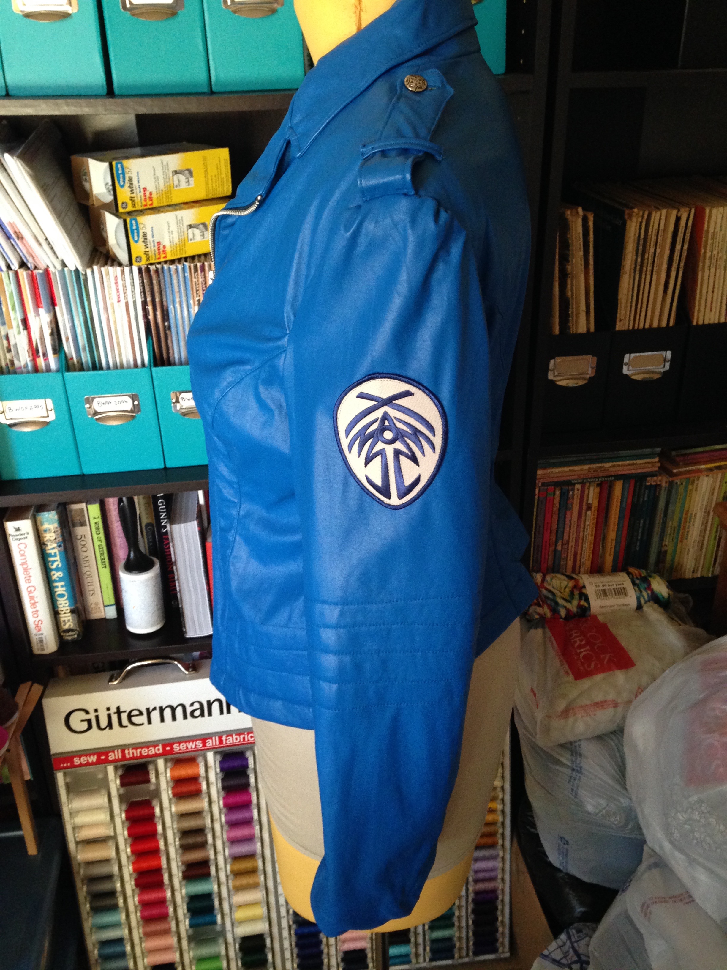 So, it’s been a while since I’ve sewn anything fun for myself.  Actually, scratch that, it’s been a while since I’ve sewn anything for myself at all.  I’d fallen into a bit of a sewing rut, and after last year’s awful summer, I hadn’t had much energy or desire to sew anything at all.  This whole year I’ve really only touched my machine when I was doing skating costumes for others.  But despite the lack of motivation, I haven’t had any lack of ideas, and when I was able to get tickets to this year’s San Diego Comic-Con (I have really awesome friends!), I was inspired to sew a few things the week before I left.  The first was an awesome pair of TARDIS PJs (post to come), and the second was something I’ve been wanting to sew for a while – a biker jacket inspired by Brandon Sanderson’s Stormlight Archive series.  In the books one of the main characters eventually becomes a guard, whose uniform consists of a blue coat with silver buttons and white lining, and the symbol for Bridge Four (and his old way of life) as a patch on the sleeve.  While I very much want to create a book-accurate (gender-bent) version of the costume, I also really wanted to make something that I could wear in “the real world.”  I’d been inspired by the cute ideas at DisneyBound, and thought, well, maybe I could do a StormlightBound?  Or, more broadly, BookBound?  (Hehe, puns.)  Though I guess this idea could also fall under the “casual cosplay” category as well.  In any case, with all of these ideas bouncing through my head, I thought: Kaladin – as a modern day biker chick.  Yeah, I can rock that.