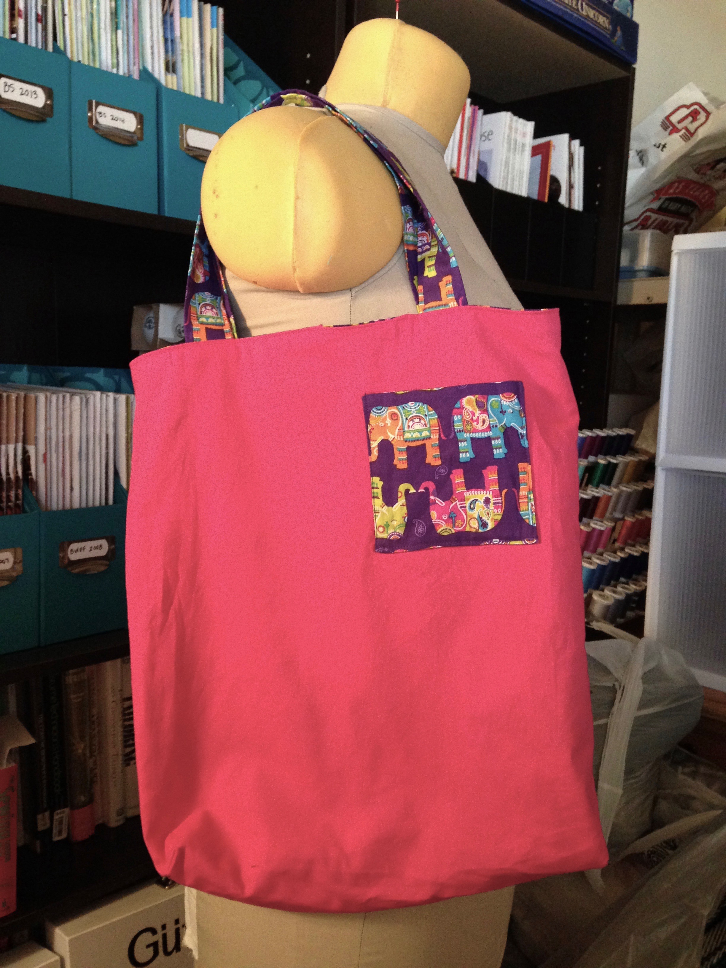 One of my friends recently had a birthday, and (very last minute) I decided to sew her some gifts. I’d stashed this purple elephant fabric with her in mind last year, and it seemed the right time to pull it out. I knew I wanted to make a bag, but I needed it to be fairly simple so I could finish it on time. Which is when I remembered that I had a Craftsy Class which included instructions to make a basic tote. This is the first time I’ve really sewn along with a Craftsy Class, and I have to say I found it really helpful to finish this project in a quick manner. I’m definitely more of a kinesthetic/visual learner, so I think watching someone make this project as I made it really helped me finish this project quickly. It wasn’t a particularly difficult project, the written instructions are really good, but there were some cool tips in the video instruction that I think I’ll be able to apply to other projects in the future. The other nice thing is that they don’t take up a lot of fabric. I was able to make the tote and the pouch with about 1 yard of main fabric and 1/2 yard of contrast. Granted, I changed the pattern a bit so that I used more of the main fabric, but it is still a very minimal investment fabric-wise. The best part is that the bags for my friend turned out really cute! I was pretty happy with the results, especially with the sort of last-minute slap-dash effort I put into the project.
