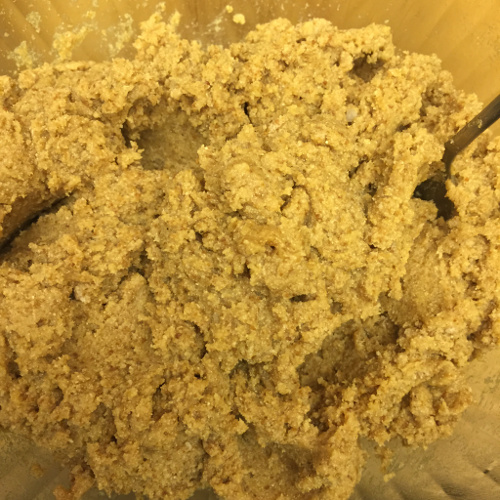 - Make topping by combining 1 cup flour with coconut sugar, a half cup of melted coconut oil and 1 teaspoon cinnamon in a medium bowl. Mixture should have the consistency of moist sand. Add 1/2 cup chopped pecans.