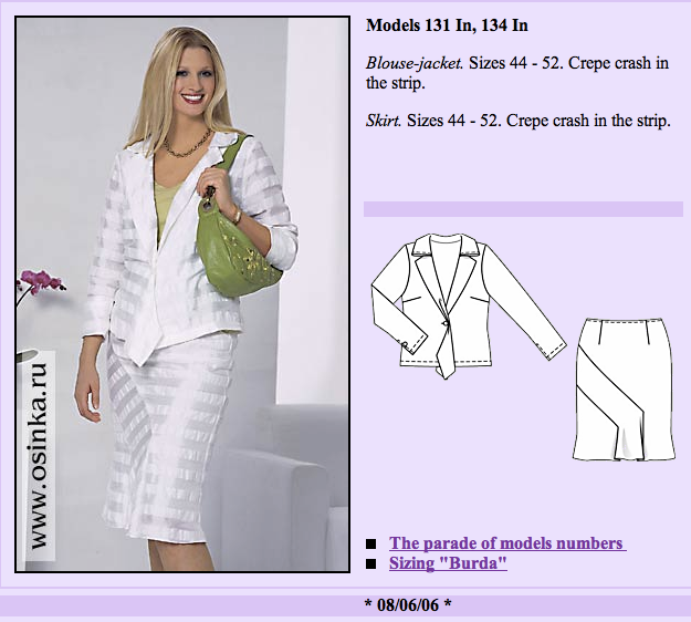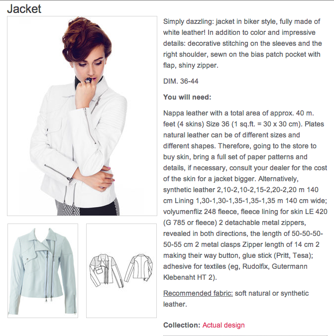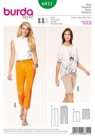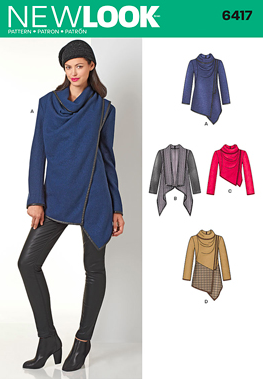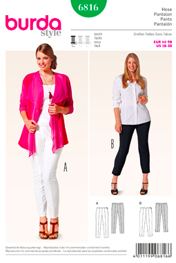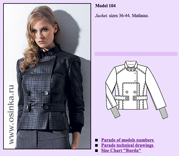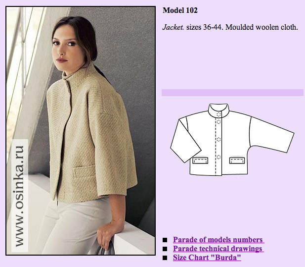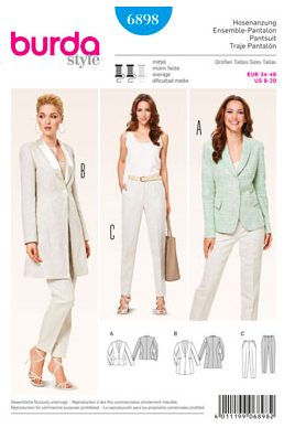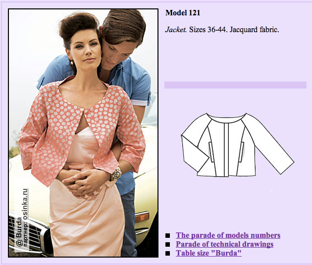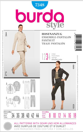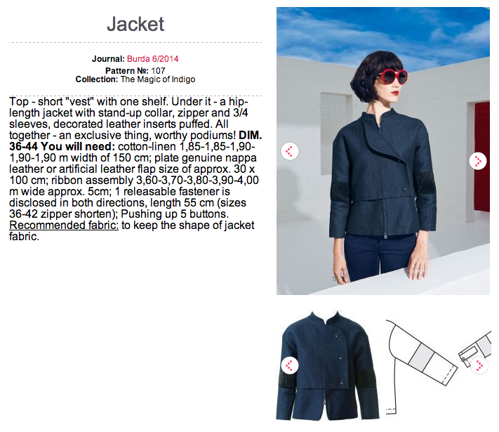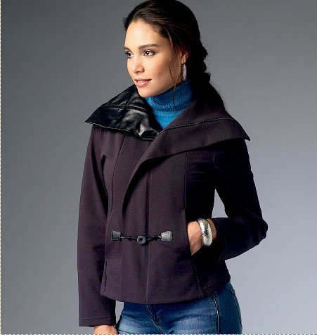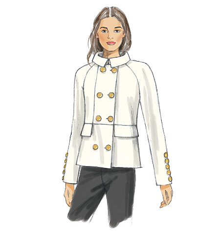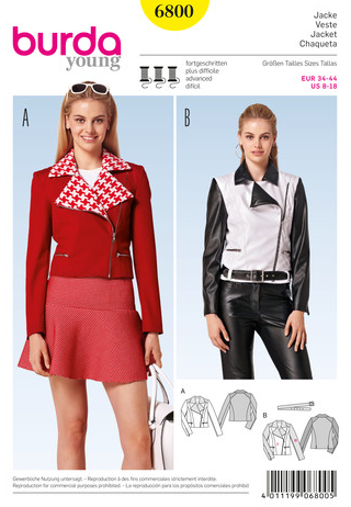 Burda 6800: Short jacket, ending just above hip level.  The lapels add angular detail, and the zip pockets add a slight emphasis to the horizontal line.  The shoulders are also slightly extended.