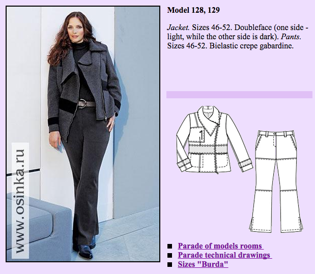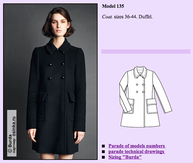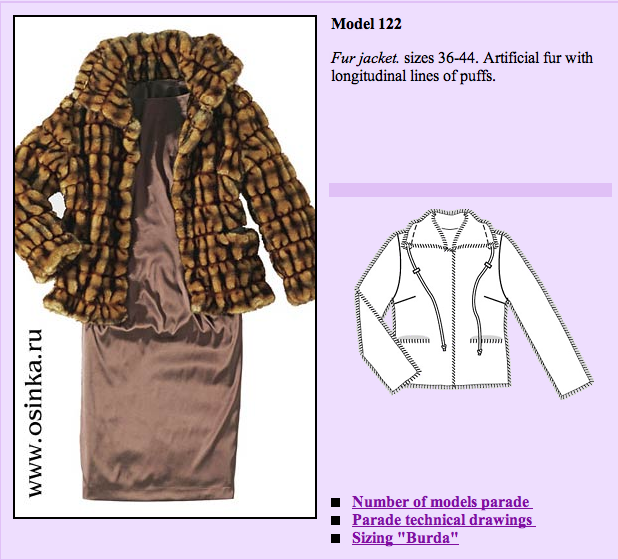 BS-11-2008-129A: This Burda Plus coat has a cropped line to the top of the hips.  The shape is short and boxy.