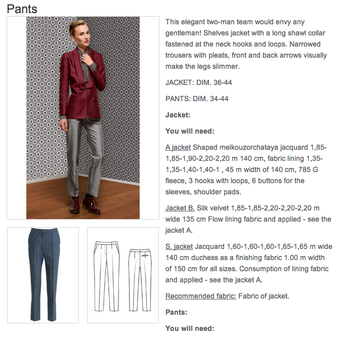 For the individual garment types, obviously, I will be focusing on the lines of the garment, as fabric and color choices would easily be controlled by the home sewer. It’s nice that he included a long list of acceptable fabrics though!