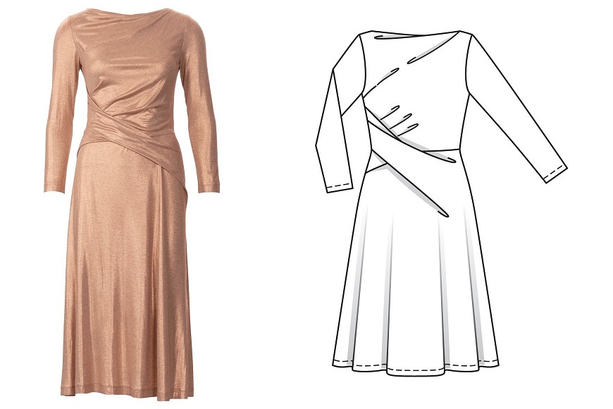 Another style I love! I’m always excited by the cool twisty patterns Burda has. I’m not sure how I feel about either of the images on the model, but the garment photo of the gold dress is really speaking to me. Perhaps in a less reflective fabric it wouldn’t look so messy in the model photo. Hmmmm.