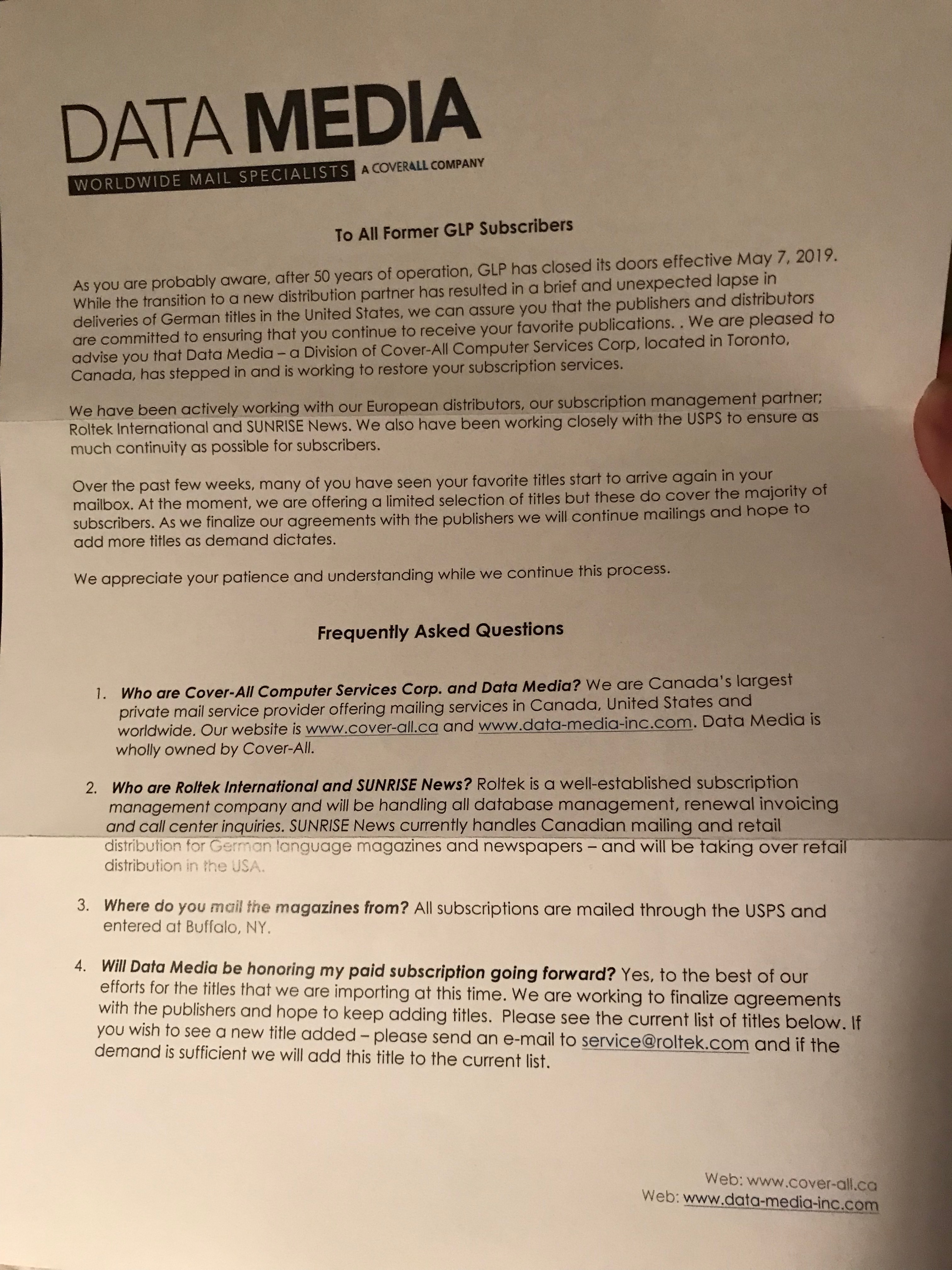3. I too got this letter. However, I have had absolutely no luck contacting them. I’ve left multiple messages requesting call back (when calling, leaving voicemail is only option) and have also emailed. My issue is trying to confirm a renewal that was done through Amazon right before news of the demise of GLP. Next month’s issue SHOULD start new subscription period. I plan to keep leaving messages and sending emails but I do have to say, I’m concerned about the lack of response over the last two weeks. Hoping and praying all will be well!!!