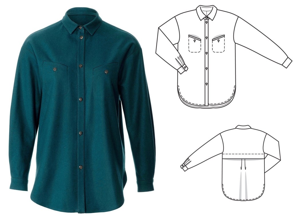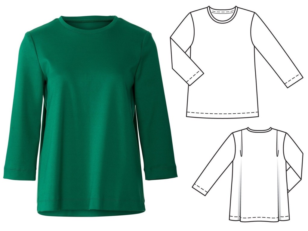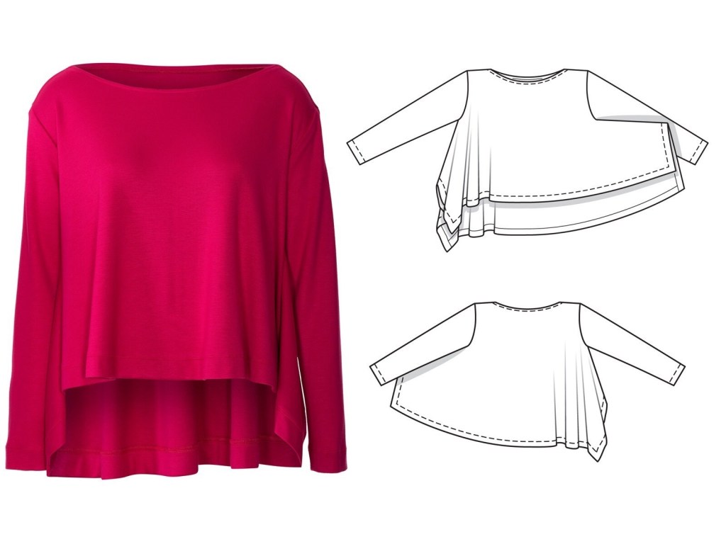 Ok, so the line drawing and garment image aren’t too inspiring, but I think the model looks super fabulous. Maybe this top requires that your friends always walk in front of you with a wind machine so you can always look amazing? Regardless, I think I’d want the front of the shirt to be a bit longer, but I do think that the model image has definitely sold me on this looser fitting garment.