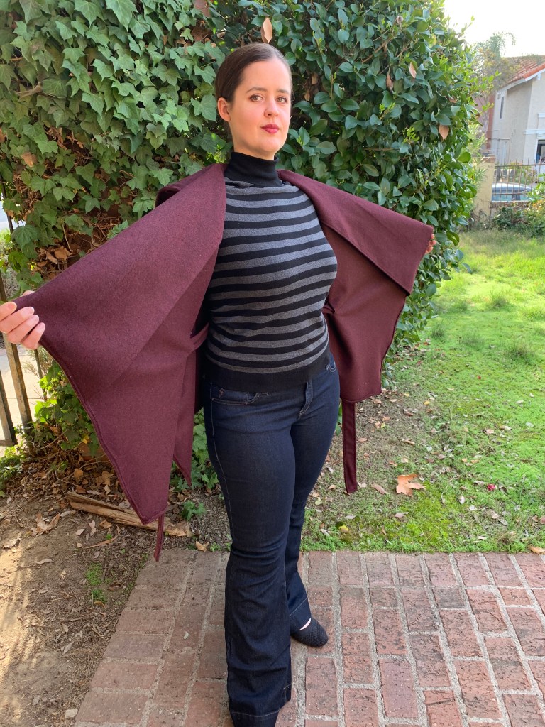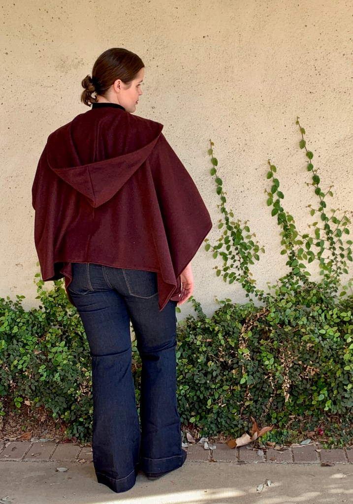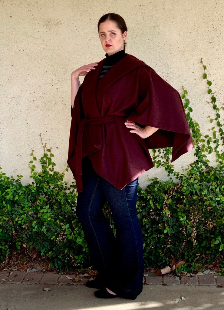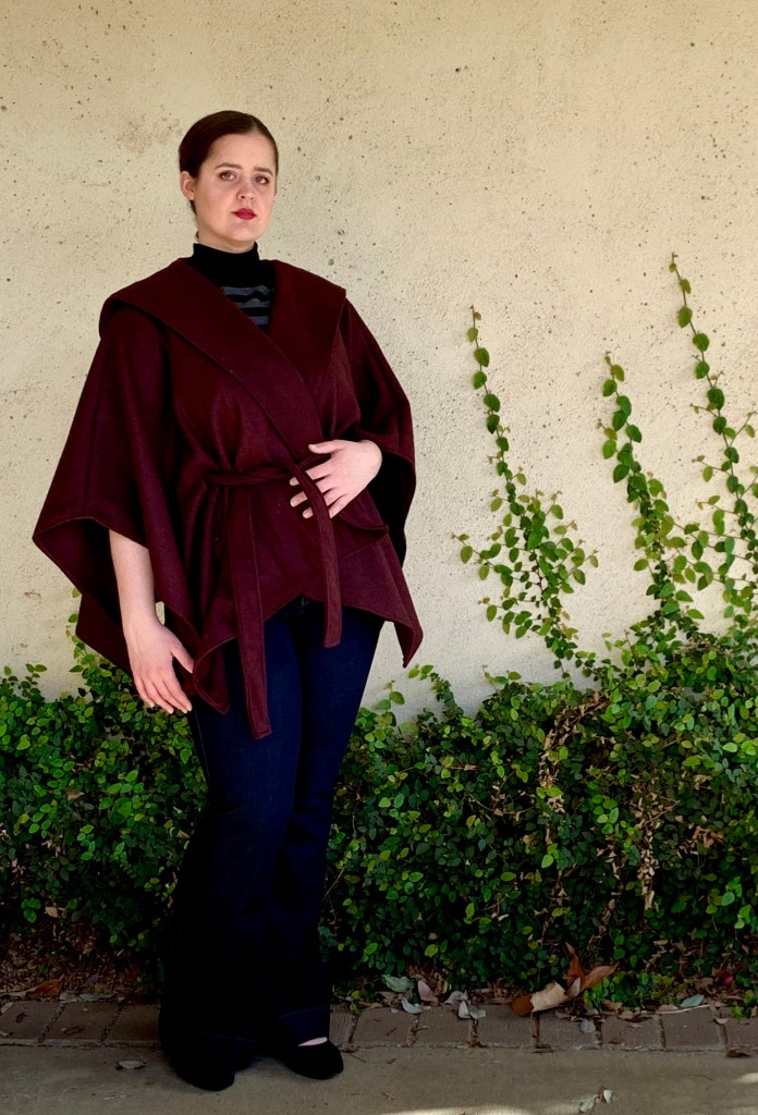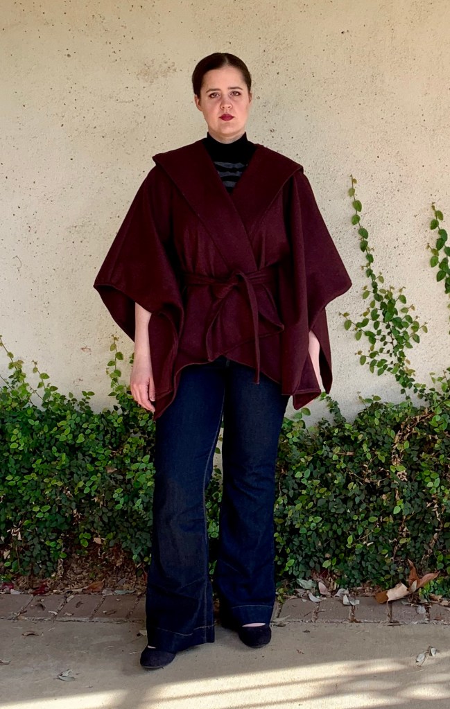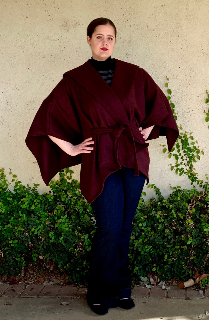 Pattern alterations or design changes you made:  None, except after following the pattern exactly, I ripped it all apart so I could sew it in the usual manner to have enclosed seams along the front, did a zig-zag stitch to cover the internal seams, and did a narrow hem finish around the bottom of the cape because I just couldn’t handle the frayed fabric bits flying all over the place.