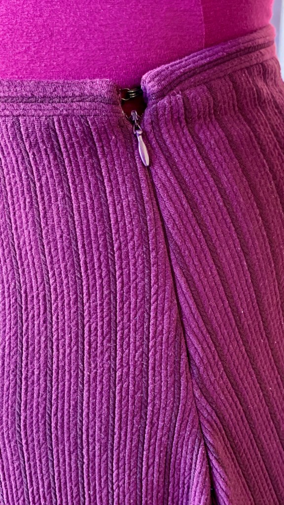 I think the invisible zip turned out really great, and I also added a lining to the inside. A year ago I probably would have been dead set on finishing the waistband with machine stitching in the ditch, but I’ve spent a lot of time over the past year watching a lot of historical garment sewers on YouTube, and I’ve been convinced on the value of hand sewing for finishing details. So I decided to hand-sew the waistband finishing and the lining around the inside of the zipper: