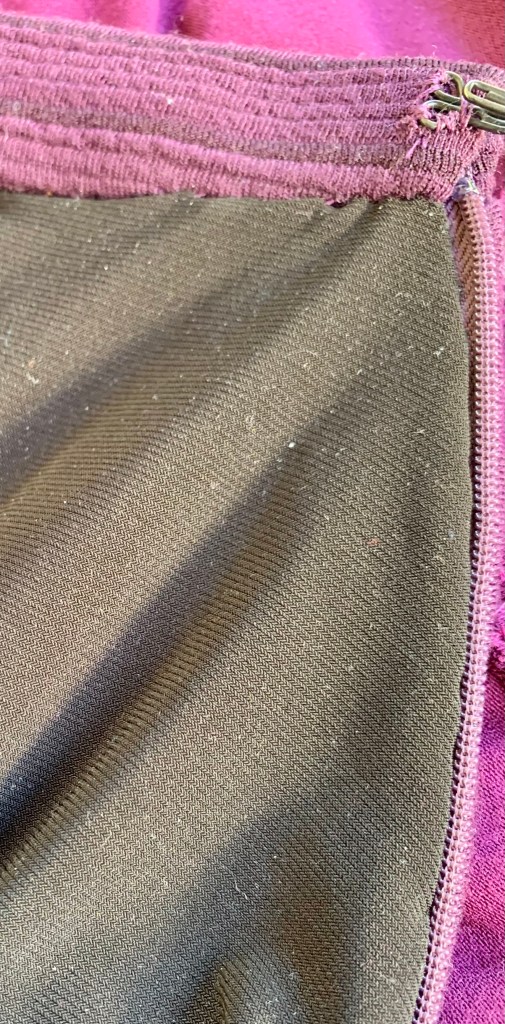 Fabric used: I used a thicker double knit (presumably poly) for the outer skirt, and a thinner stretch lining fabric. I don’t know the fiber content of either, as I think these were both mystery fabrics I picked up from the Michael Levine Loft back when it still existed. They are both definitely synthetic fabrics with a decent amount of stretch.