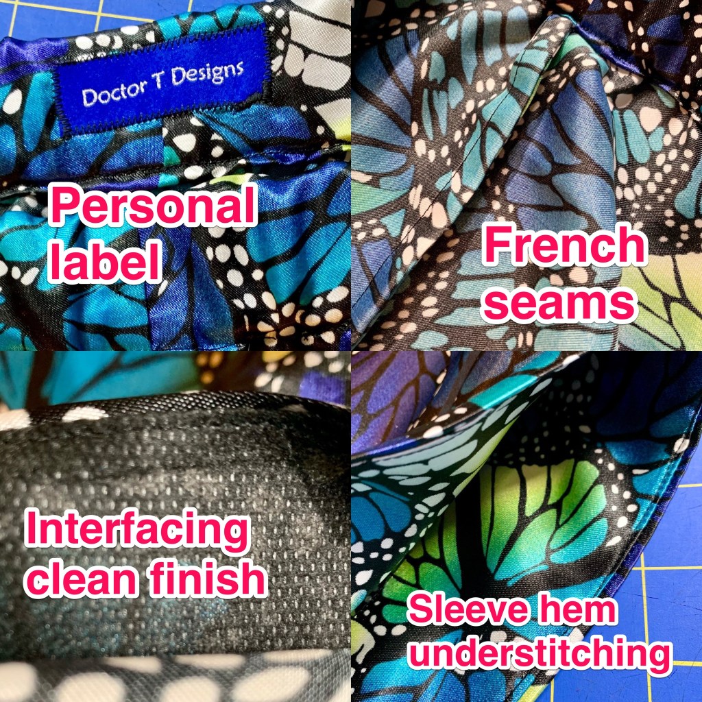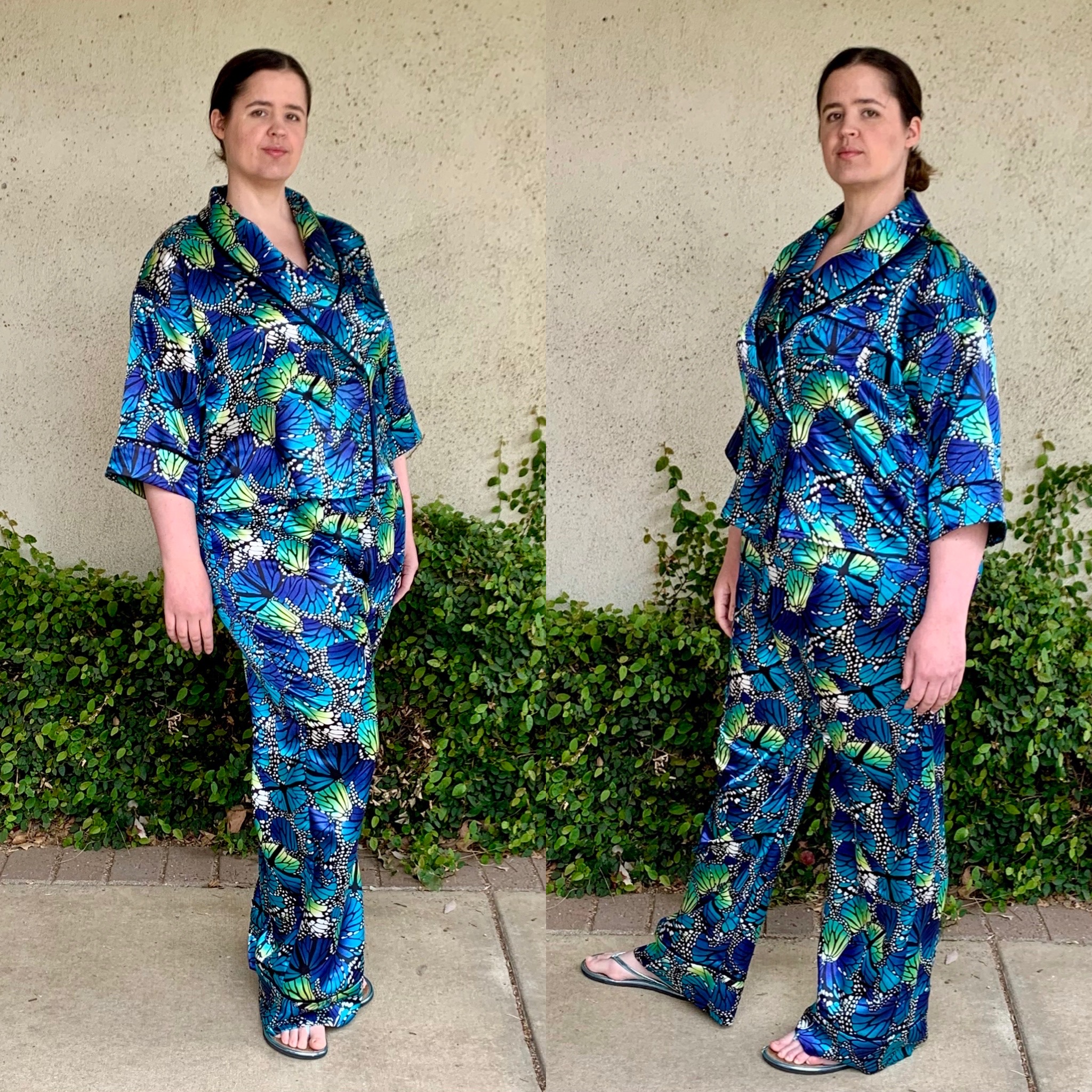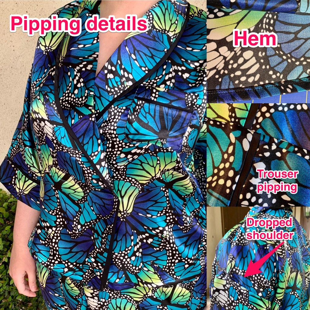 Fabric used: I used a polyester satin butterfly print that I bought from Jo-Ann years ago. For the Bee, I’ve decided that I’m going to try to sew from stash as much as possible because (1) stores are still very locked down in my area, (2) shipping has been very irregular so I don’t want to have to rely on deliveries if it can be avoided, and (3) I have a massive stash of fabrics that I love and really should use. I’m so happy that I went with this fabric! I’ve had it for years, but never used it because I hadn’t bought it for a specific project but “just because it’s pretty.” Although I would have loved to use something a bit more luxurious like a silk satin or a very soft cotton, I didn’t have anything in the stash that was a large enough quantity to get the fully matched pajama set I wanted to make. I decided to prioritize the shape of the pattern over the fiber content of the fabric, and I’m really happy I went with this print. It makes me smile every time I look at it and it has all of my favorite colors in it. The trim is a flat bias pipping I made from a scrap of leftover Bemberg rayon, which was great for a bit of stash busting, and I used a bit of a lightweight fusible interfacing on the collar facing.