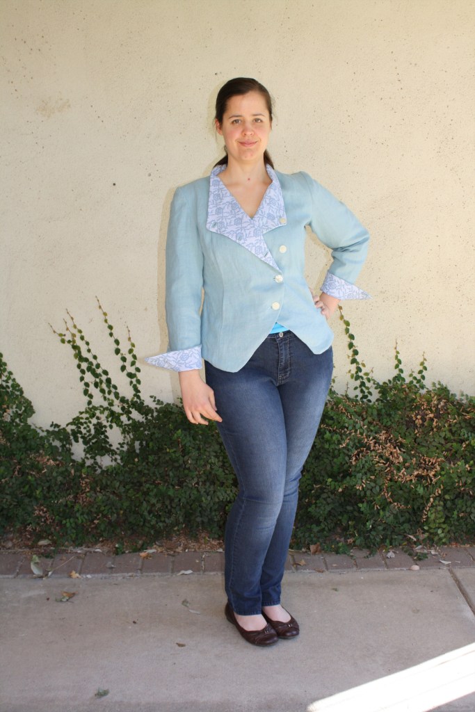 - BurdaStyle 06/2012 #121 was a jacket I made twice. I made a blue linen version because I was enamored with the image in the magazine, but also a copper fake leather version because I really loved this pattern. I actually wore both of these quite a bit, though I think the fake leather version saw a bit more use (the linen version was just slightly too heavy to wear in summer and too lightweight to wear in fall or winter). This was another jacket style I really loved, and these saw a lot of use in the wardrobe. I still have the linen version, but I think the fabric on the copper version gave out, so I eventually go rid of it.