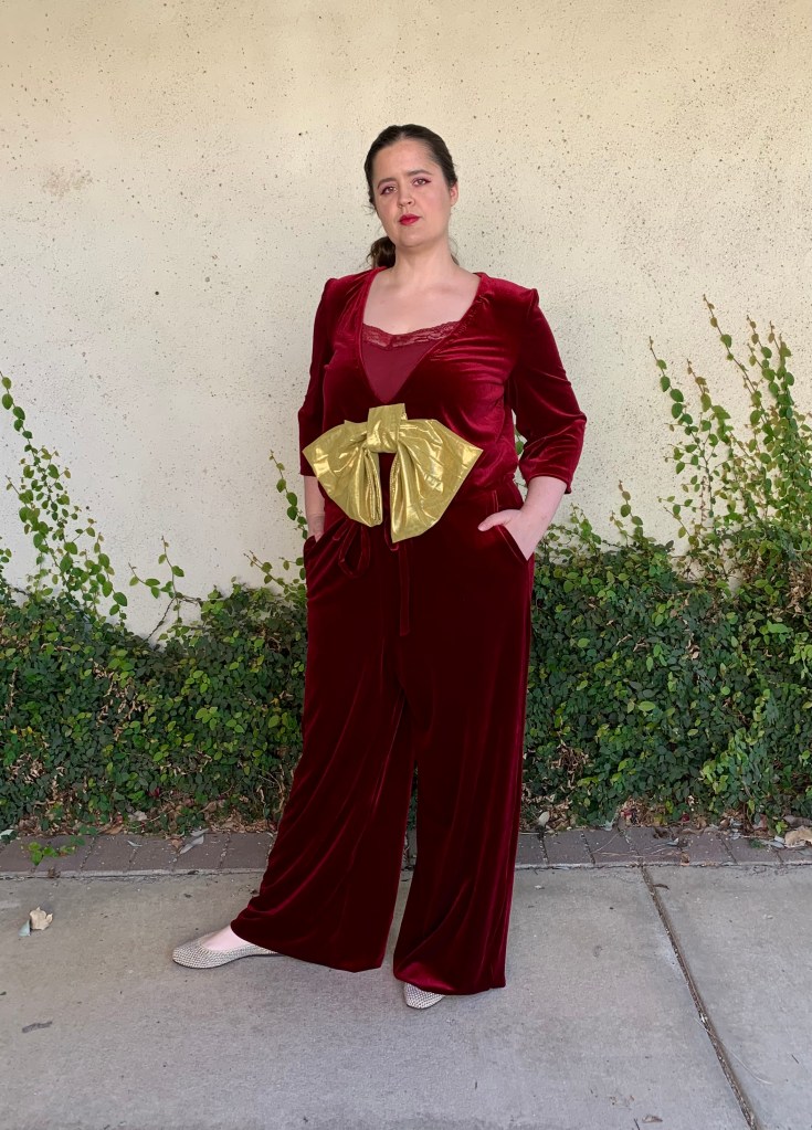 Fabric used: I used a burgundy stretch velvet from Blue Moon Fabrics for the jumpsuit, and some leftover metallic mesh I found in the stash (probably also from Blue Moon) for the bow.