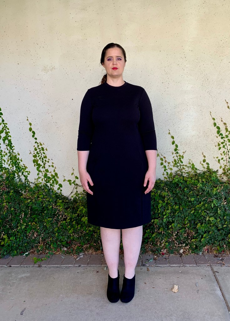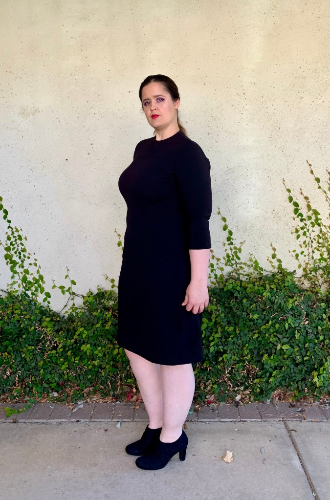 I think there are a lot of things that are working better for me in the second version. The lower collar is definitely more versatile (and easier to put on), and I do like the 3/4 length sleeves. This dress is very basic, but also very versatile, and all of the design elements from the color blocking are just seams for that help with the garment fit in this version, so they don’t really stand out. I’m sure a version that utilized a pipping detail could actually be quite nice as well.