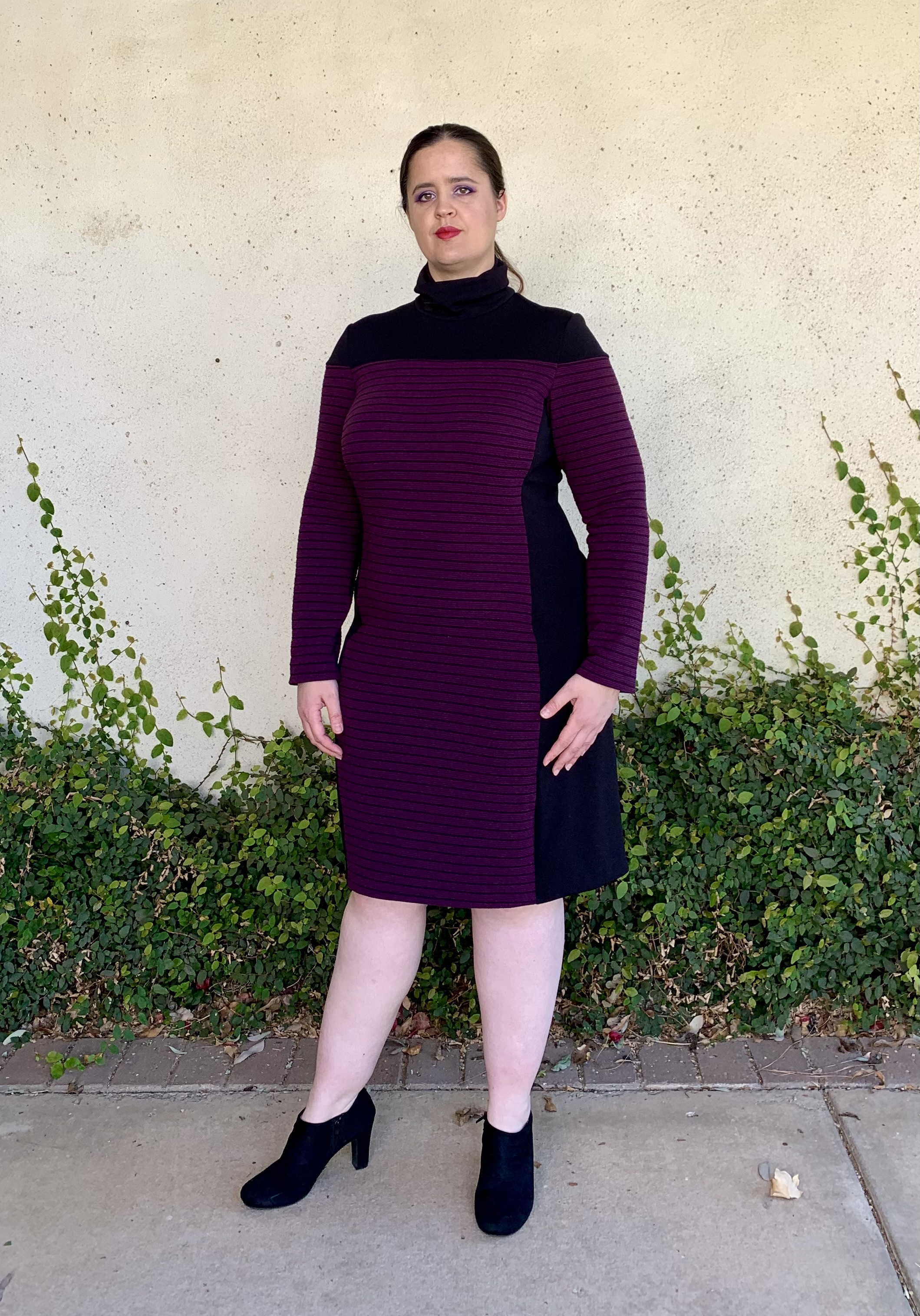 I saw the Star Trek uniform right away! But probably only because I’ve done something like this, too. I made a colorblock ponte dress in burgundy and black, Burda 6851, and the first time I tried it on, I was like, well, hello, Captain Picard. I totally love it though. And yours is very flattering.
