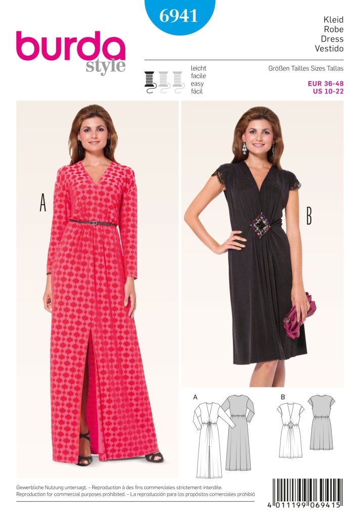 Pattern Description: Jersey dresses in two lengths with deep V-neck and gathered skirt and bodice. Version A is full length with a slit skirt and full length sleeves. Version B is embellished with a beaded adornment and small lace sleeves. I used the full-length skirt from View A but the short sleeves and embellishment idea from View B for my version of this dress.