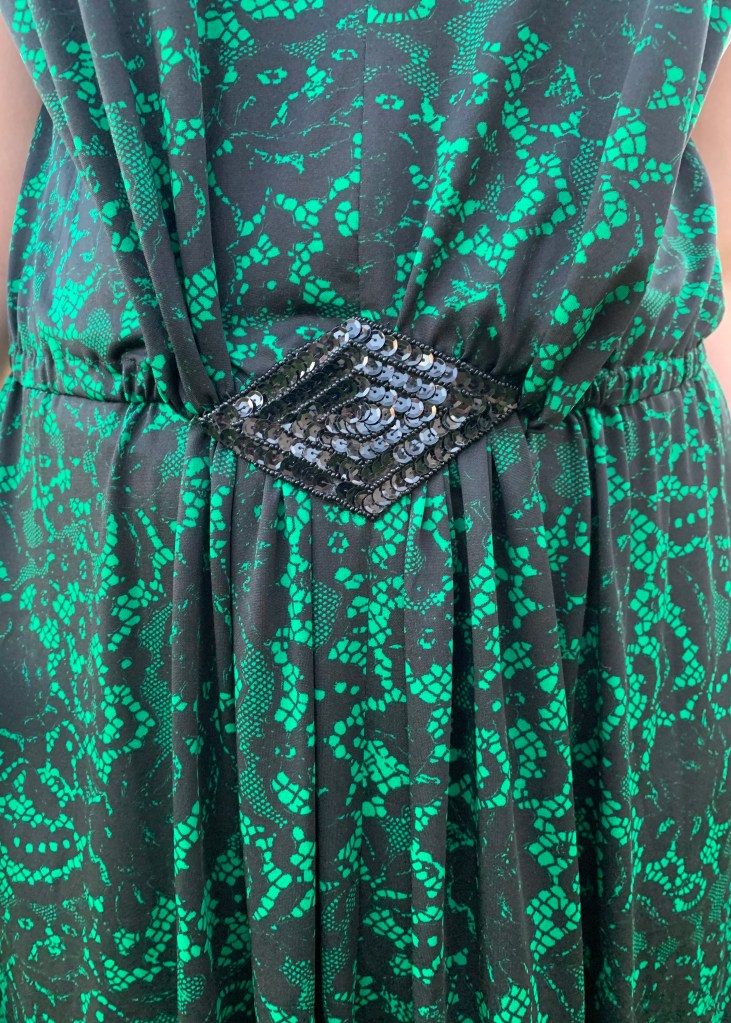 Conclusion:  I love it! I wore this dress to a wedding and it was super comfortable and I felt really elegant (double win!). Apparently green is the trending color for 2022 – a lot of the guests were wearing green, though none in a bold lace print, and I’m sure their dresses were much less comfortable than mine. One of the waitresses even commented on the dress, so that was really nice. Plus, it also packs like a dream because it’s an ITY knit, which makes it super easy to look put together with minimal effort. I only wish the front waistline was slightly higher (I think I made the front bodice slightly too long with my adjustments and then the weight of the full skirt is dragging it down a bit), but otherwise I really love how quickly this dress came together and how well it turned out.