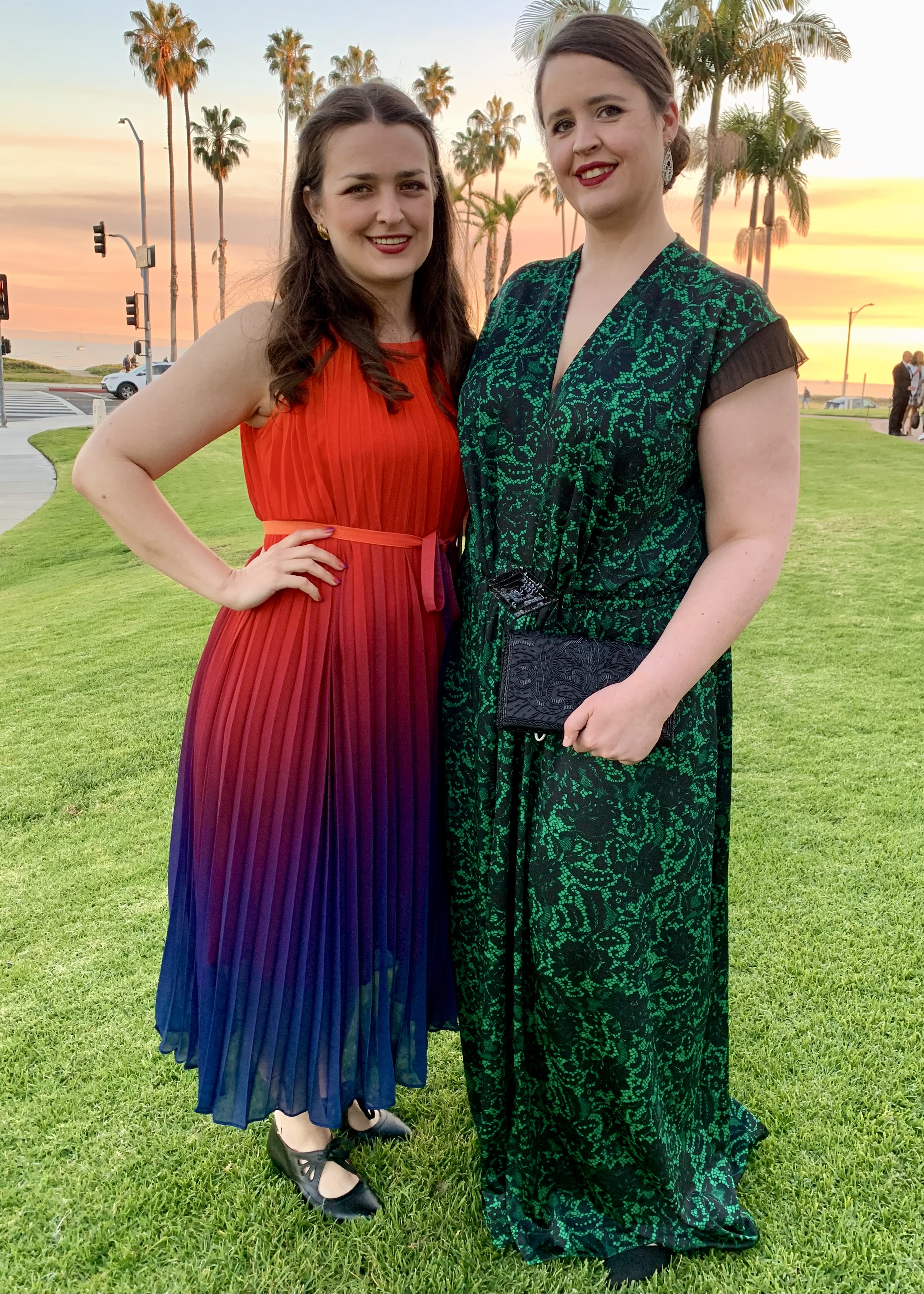 What did you particularly like/dislike about the pattern?  I love the fit of the shoulders and lace sleeves; it is the perfect amount of coverage for a cut-on sleeve without being restrictive in motion. I also really love how easily this pattern goes together. I will warn that it does require the use of a sewing machine to construct. Despite being for knits, it’s not the type of design that you can sew only with a serger and coverstitch (though I did use both to aid in seam finishing and hemming). However, it is really simple to put together as long as your sewing machine works well with your fabric choice (mine did). I also really love that the elastic for the waistband doesn’t go completely around the body – it stops just short of the front bodice gathers, which both makes the gathers more soft AND allows extra comfortable tummy room for a night of partying and eating. My only dislikes are that the weight of the full length skirt seems to pull down the bodice front a bit and that the v-neck is really low as drafted.