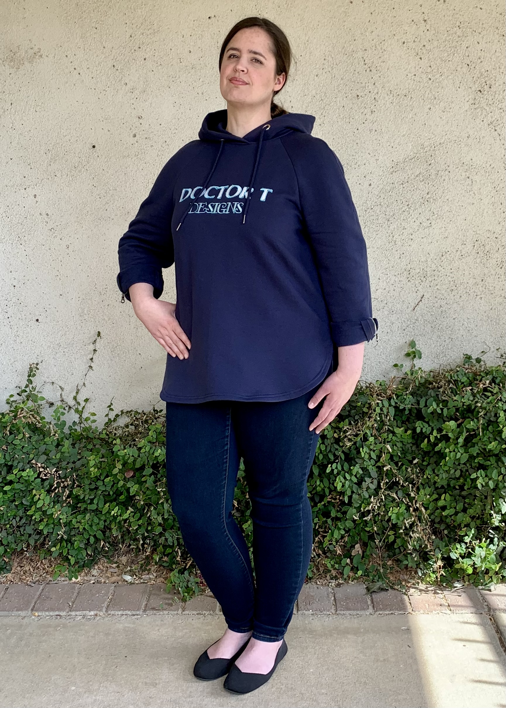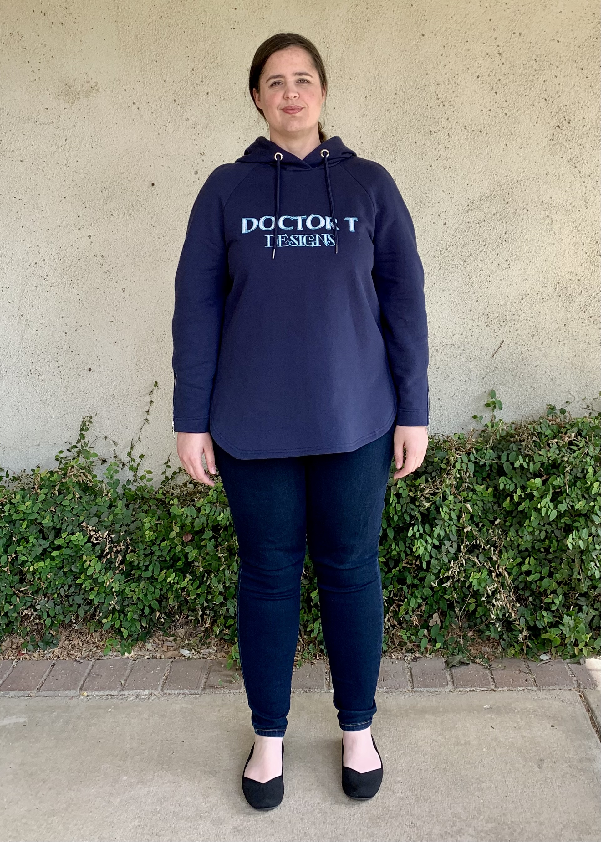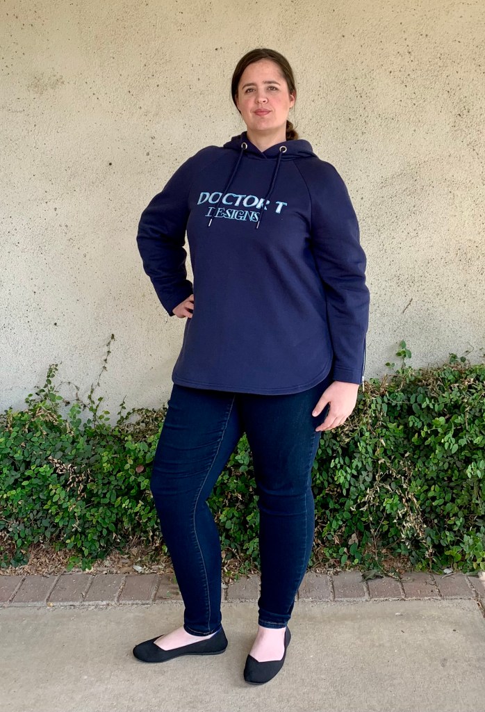 Special techniques used: For the embellishment I used my embroidery machine to stitch out a “Doctor T Designs” embroidered design. I created this design in my digitizing software. It was the first time I used a technique to turn a computer font into an embroidered design, and it was a really cool technique to learn. However, getting the design correct actually took several tries and was definitely a significant part of the challenge for this project. I’ve included some photos of the testing process, where I was trying different stitch types, font styles, thread combinations, and appliqué fabric types to make sure I got a result I would be happy with. While I’ve used appliqué techniques in the past, this was actually the first time I’ve done an appliqué with digitized machine embroidery, so it took a lot of iteration to get the technique and design right. For some of the more subtle/utilitarian design embellishments, I had to shorten the metal zippers (which I have done before), and install grommets (which was a new technique for me). Overall I learned several new techniques to create this hoodie, including digitizing True Type font in my software to create machine embroidery appliqué, sewing in-seam visible zippers, and installing grommets.