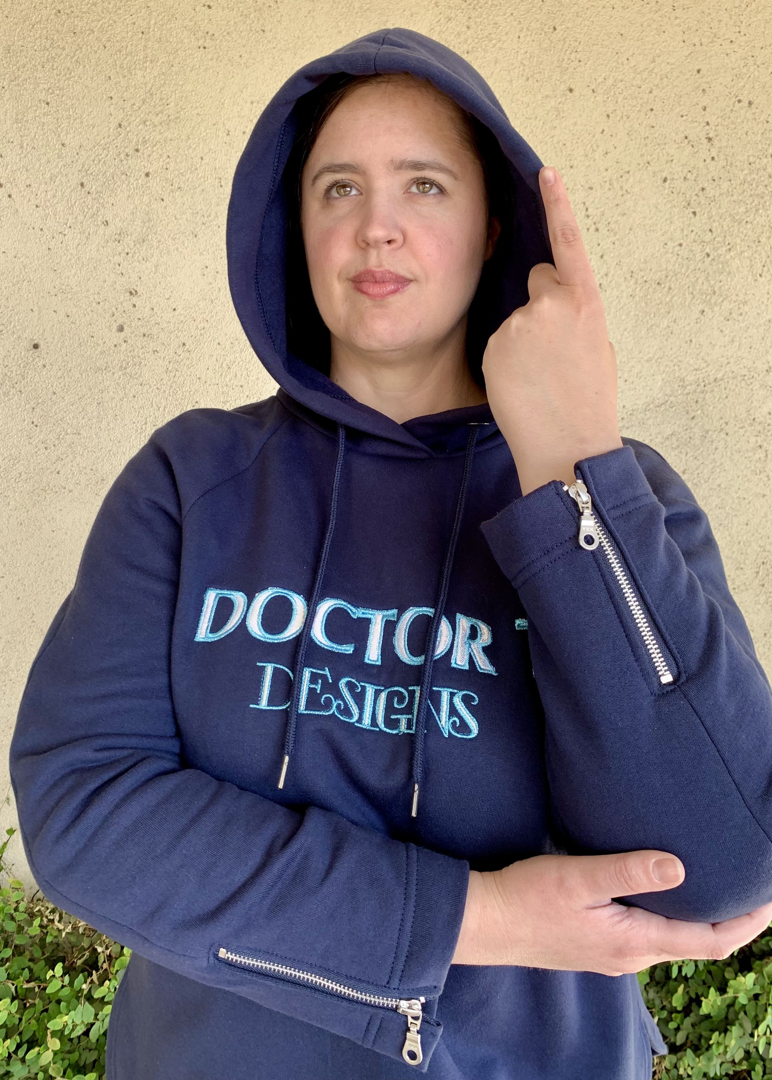 Fabric and materials used: For the main hoodie fabric I used a cotton sweatshirt material from my stash that I bought from Fabric Mart many years ago. For the embellishment, I used an old remnant of silver Mystique spandex for the “Doctor T” lettering appliqué along with metallic embroidery threads from Sulky and Superior Threads for the other embroidery design. I also used grommets for the hoodie string opening, and 2 metal zippers on the sleeves. I ordered a hoodie drawstring because I wanted a color to match the hoodie fabric. For construction I used all of my machines; I used the serger to finish the edges, my sewing machine to do the construction, my embroidery machine to create the embellishment, and my coverstitch to do the hem finishes.