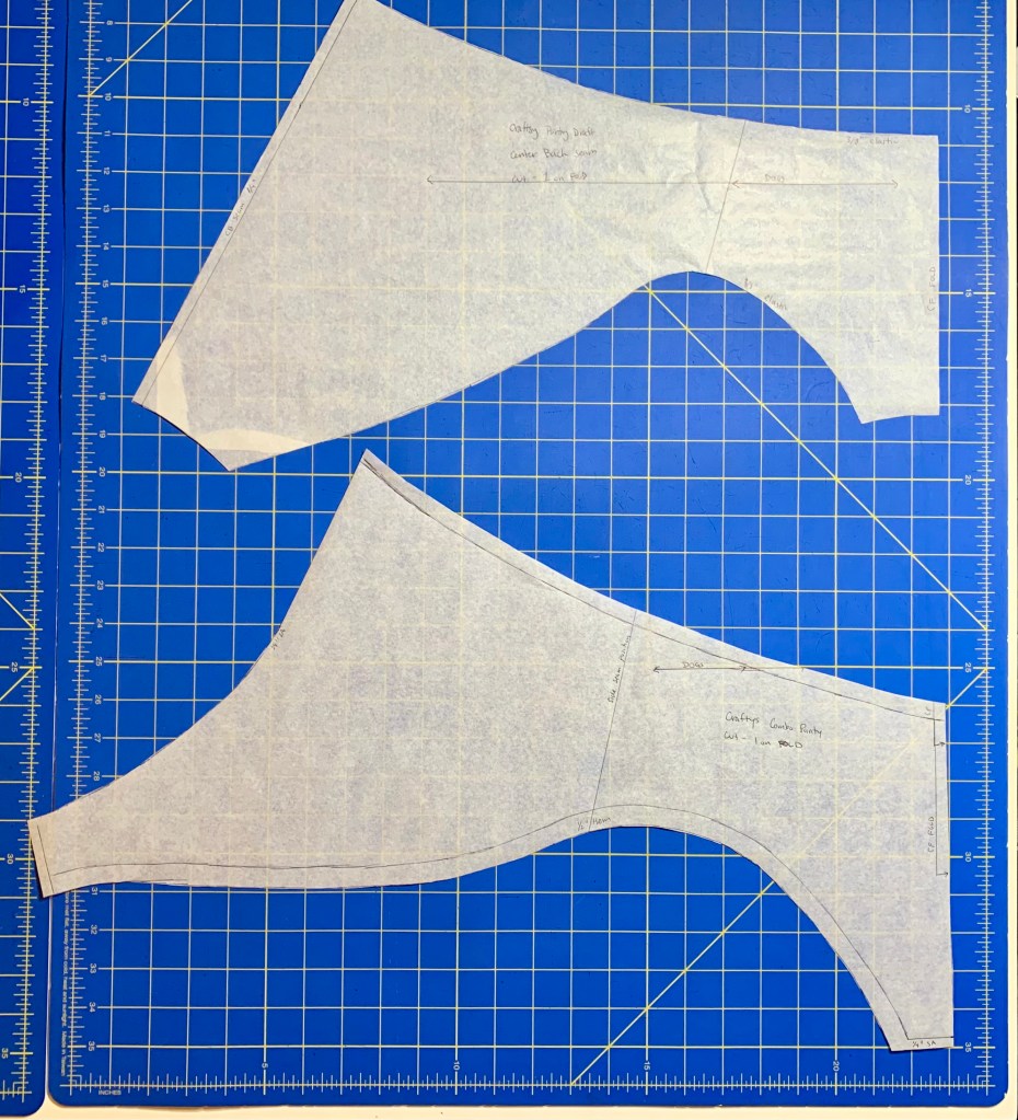 After making the test versions, my sister and I also found the initial draft of the crotch gusset to be oddly short, especially when compared with ready to wear styles we had for comparison. For the second version, I lowered the waistline (a lot) and modified the shape of the gusset quite a bit. I’m still tweaking things with all of these patterns, but I feel like I’m pretty close to getting a well fitting standard draft and may wish to test some of her design features variations soon. Overall I will say that probably no one will get a 100% perfect draft on the first go, but everyone will probably get something that fits way better than ready to wear, especially if you are willing to tinker with the draft and give it 2 or 3 iterations to find your perfect fit.