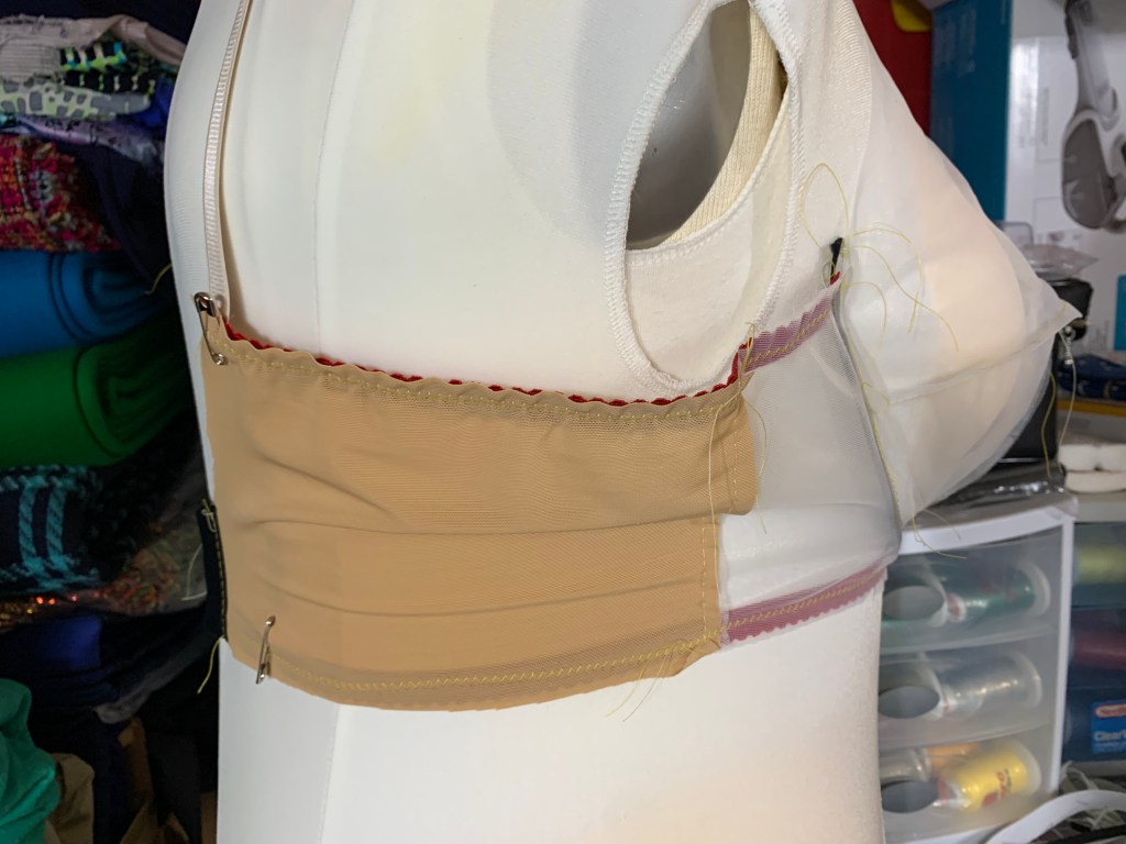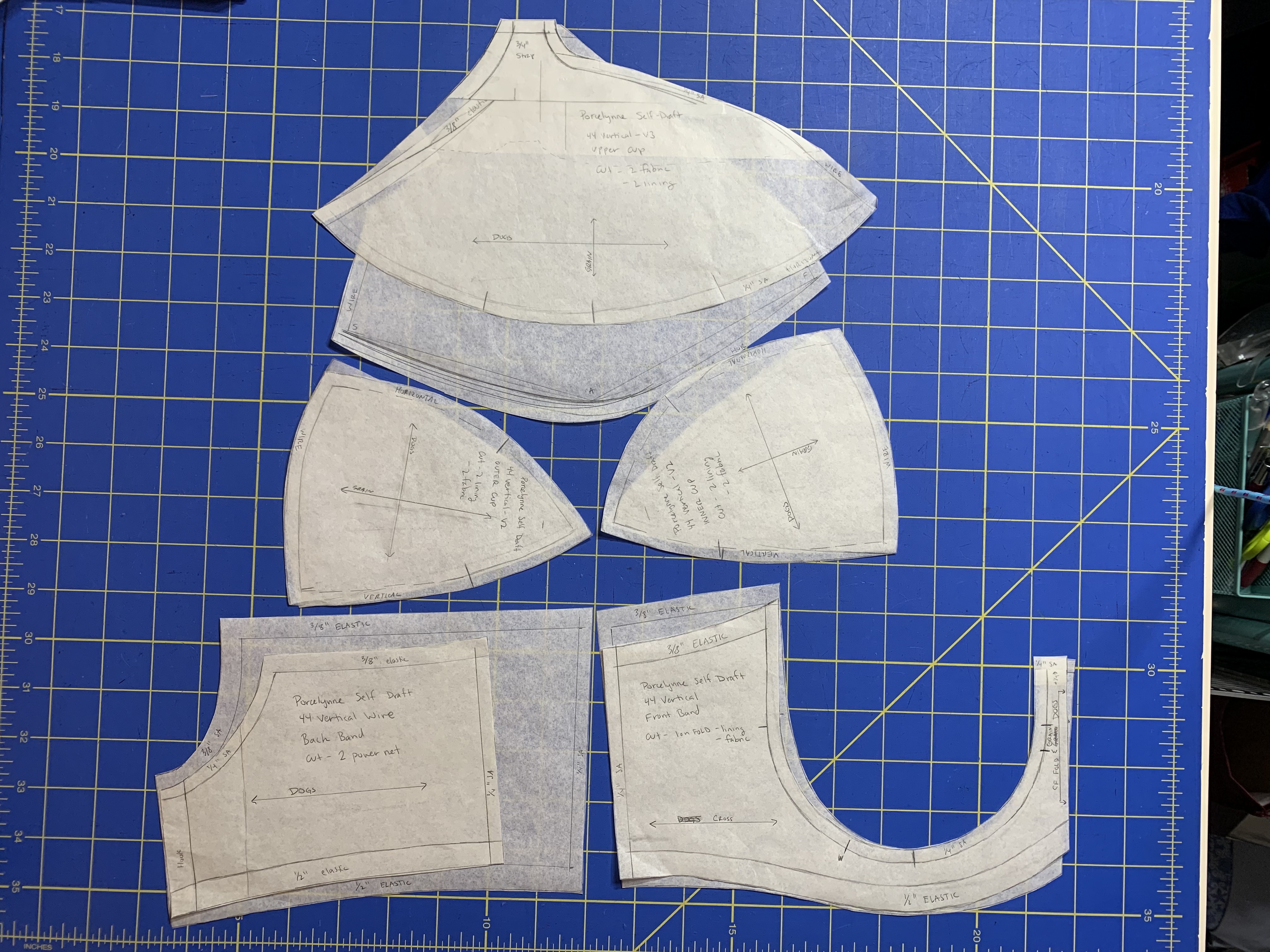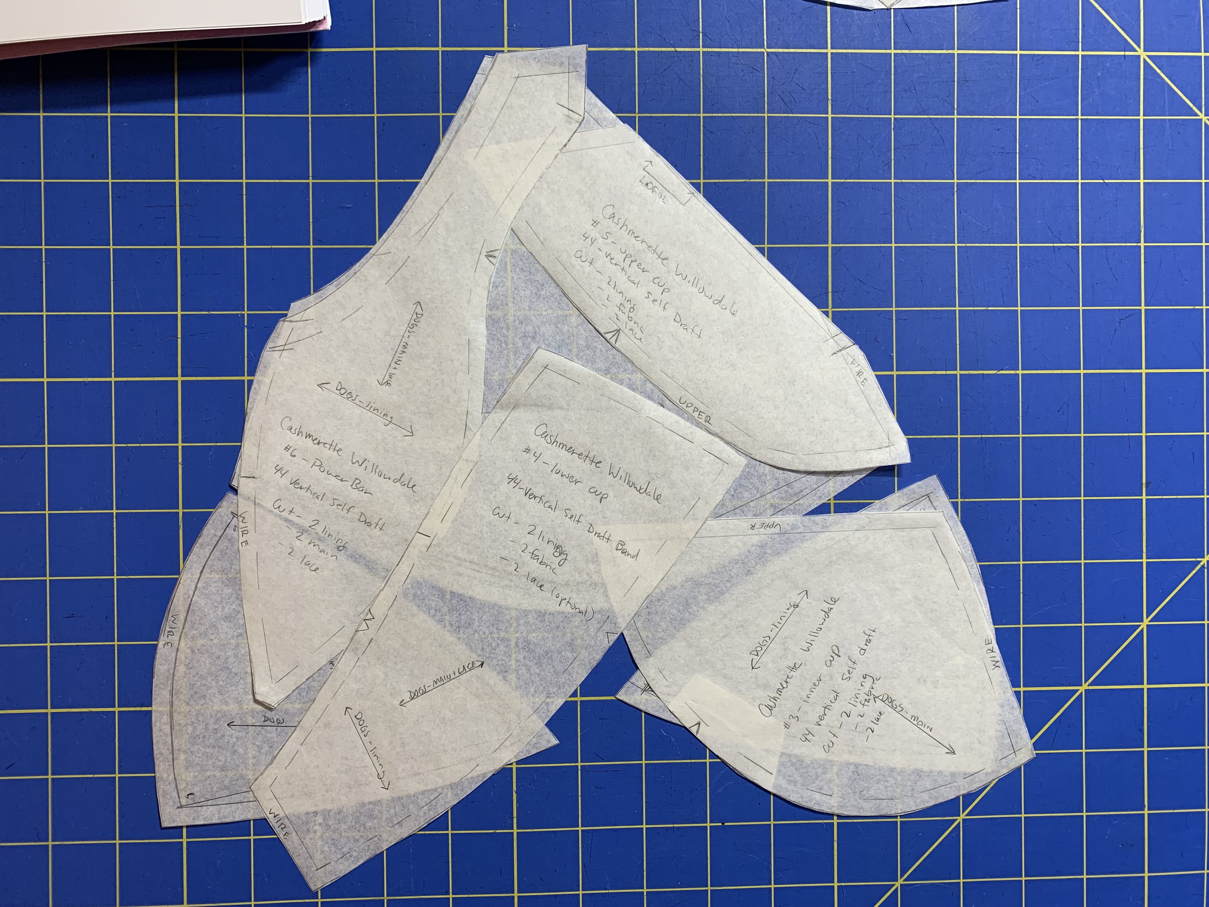 I was pretty happy with the fit of the first band for the 38 Vertical Long wire that I did using the Porcelynne “Bare Essentials” pattern drafting book and the calculator on Procalynne’s website, so I was pretty sure repeating the process for the regular 44 Vertical wire would work just as well. I was a bit stumped with how to manage the cup issue, but I thought about how the omega adjustment worked on other patterns with multiple sizes, and I realized I needed to lengthen the cup pieces to add projection. So I measured the paper cups against a Willowdale cup and found that the pattern was roughly an inch short all the way around. I added this inch to the bottom cup pieces by basically tracing the wire line, scooting the tracing paper up and inch, and then connecting the critical pattern points. I wasn’t quite sure how to adjust the top cup piece, so I basically made a sample, then pinned some scrap fabric on top and drew on it to see how to adjust the pattern to fit.