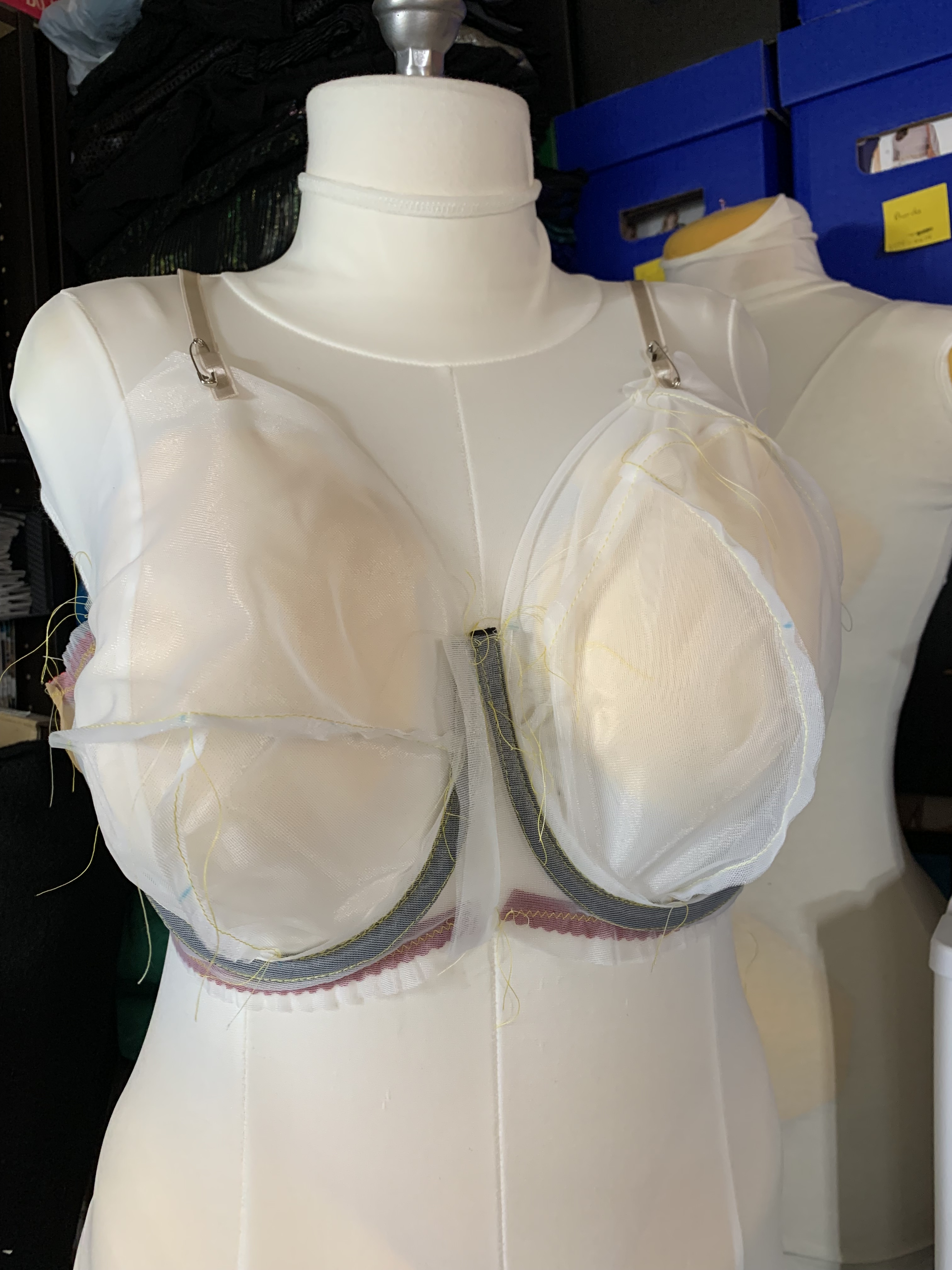 With this I felt ready for a mock up of this new pattern. I decided to test two different cups – the self draft on the left and the Willowdale adjusted for the new wire line on the right: