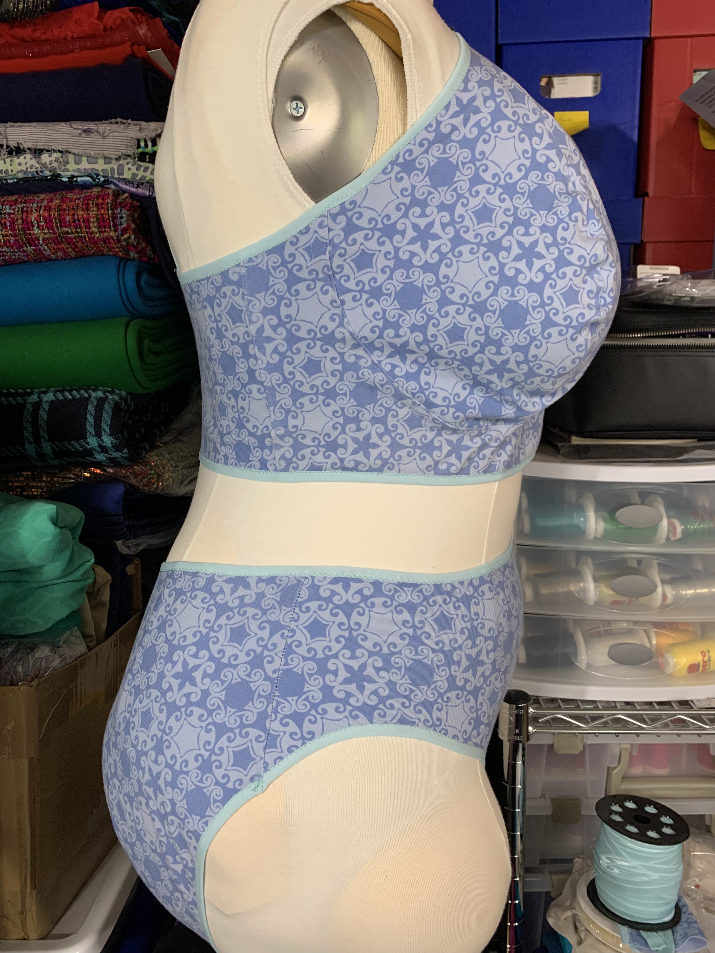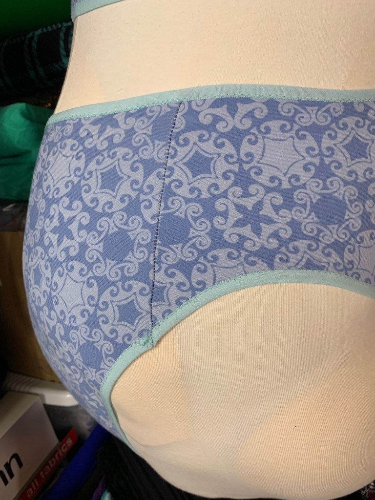 I’m really pretty happy with how this turned out. I added some extra width to the back and cut it on a fold to account for the hook and eye space (because I don’t like hook and eye for a sleep bralette), but I ended up taking it out again and using a center back seam because of the amount of stretch in the fabric made it unnecessary. Similarly, the cups are probably a little big because of using the stretch fabric, but this makes me very confident going into making this with the minimal stretch materials next. And since that was my ultimate goal, I am happy and ok with this. If I was going to make a stretch version again I would probably just cut the back on the fold and ignore the space for the hook and eyes and I would use the original cups from the 36K pattern, because they would probably stretch nicely to fit and give the correct tension. I do really like the shape and style of the bra and the finishing of the elastic at the ring is a nice clean-looking technique. I followed the instructions for View B here – I used only a single layer of fabric so there are raw edges on the inside. I think when I make my real version I will make sure to used a sheer cup lining like I have been testing my patterns in for extra support and also to help make a nice clean finish on the inside of the bra. I also tried some different techniques and stitch settings for attaching fold over elastic (I used the settings in the Sahaara instructions for the stitch length and width and I set everything in flat instead of in the round) and I quite like how that turned out as well. I think I’m still refining my FOE technique; it’s those pesky ends that can look so messy sometimes! But I think it’s getting better and overall I am very happy with how this set turned out. I can’t wait to use it this month!